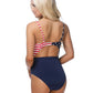 Celebrate in style with this patriotic one-piece swimsuit, perfect for your 4th of July festivities! Featuring a bold American flag print, this suit combines classic red, white, and blue with trendy cutout details for a fun and flattering look. The navy high-waist bottom offers a slimming silhouette, while adjustable shoulder straps and a clip-back closure ensure the perfect fit. Finished with a front tie accent and both front and back cutouts, this suit brings playful charm to your beach or poolside outfit.