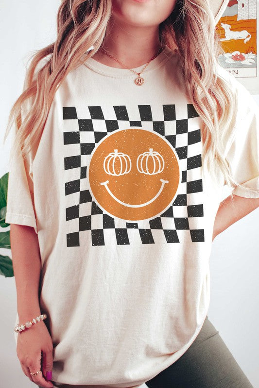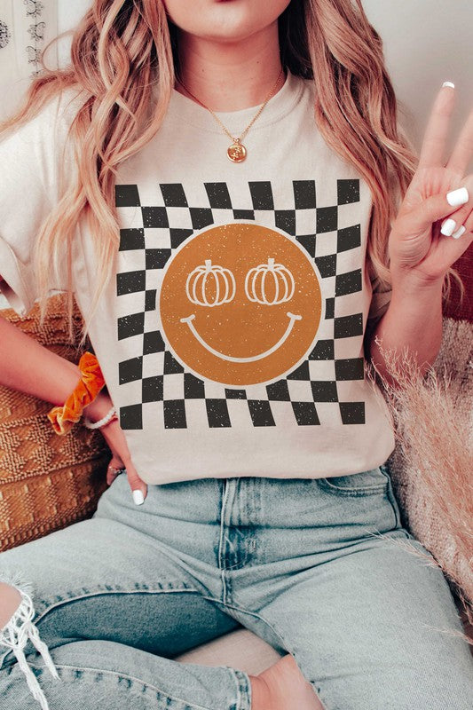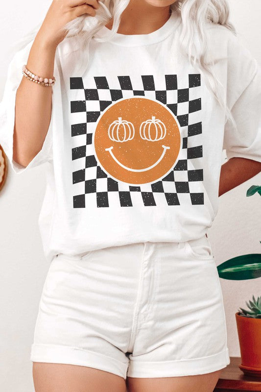 Celebrate the charm of the season with our Checkered Pumpkin Eyes Happy Face Graphic Tee. Featuring a playful graphic of a happy face with pumpkin-inspired, checkered eyes, this tee brings a fun and festive touch to your casual wardrobe.