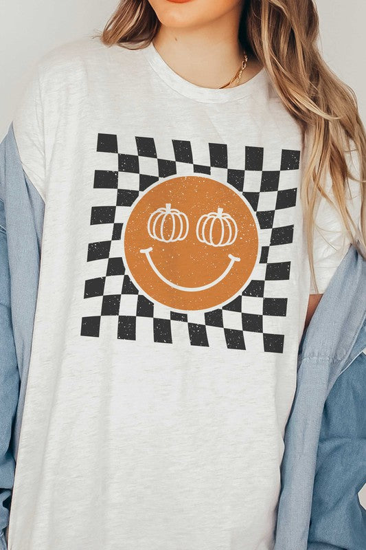 CHECKERED PUMPKIN EYES HAPPY FACE GRAPHIC TEE