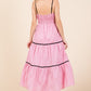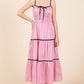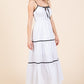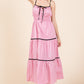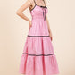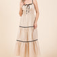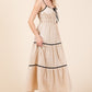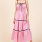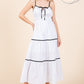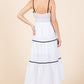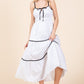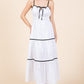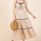 Stay stylish and comfortable in this plus-size piping detailed tiered midi sundress. Designed with a square neckline, self-tie spaghetti straps, and a flattering elastic waistband, this dress is perfect for spring and summer outings, beach days, picnics, and holiday wear. The tiered silhouette and piping details add a touch of elegance, making it a must-have for any warm-weather wardrobe.