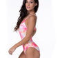 Tie dye one piece style with V-front underwire cups. Removable pads, adjustable shoulder straps, adjustable tie back. Stretch material and fit.