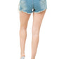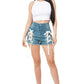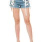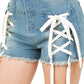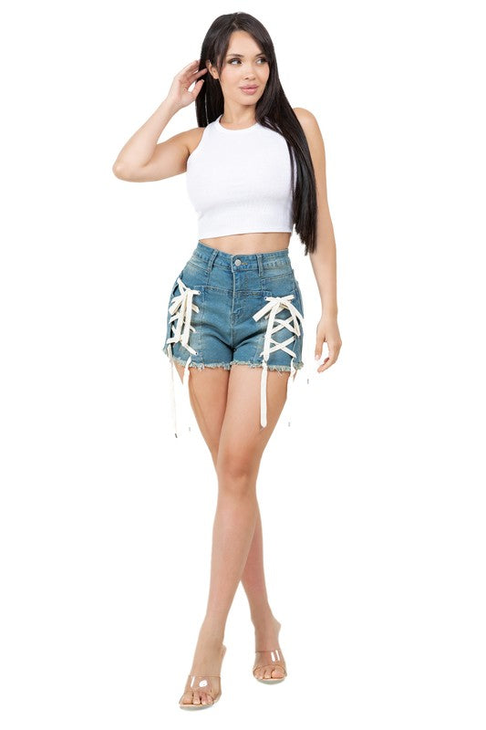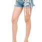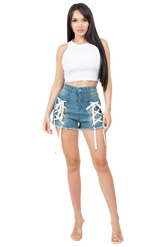 These stylish denim shorts feature a unique lace strip front design that adds a feminine touch to a classic staple. Made with stretchy fiber for added comfort, they include belt loops for easy accessorizing. Perfect for warm-weather outings, festivals, or casual everyday wear.